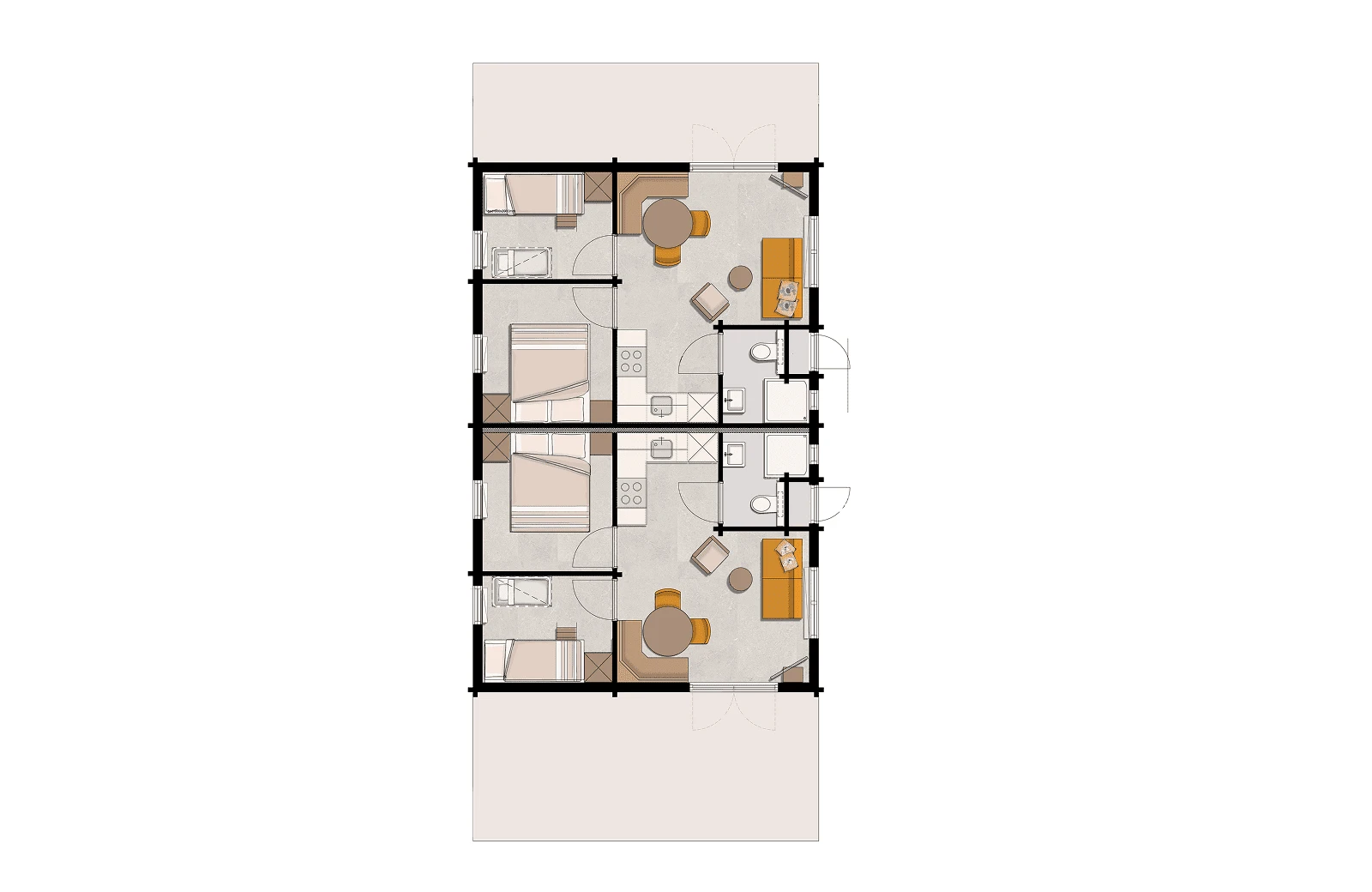 De lodge is ingericht in de vrolijke, vertrouwde stijl van Woezel & Pip. Je vindt er een fijne woonkamer met volledig uitgeruste keuken en een knusse eet- en zithoek. Daarnaast zijn er twee comfortabele slaapkamers waar je lekker kunt uitrusten, allemaal voorzien van Swiss Sense-bedden. Ook heeft elke accommodatie een badkamer met douche en toilet. En wil je extra lang van het groen en de frisse buitenlucht genieten? Dan is het omheinde terras de ideale plek om nog even samen te kletsen, eten of spelen.